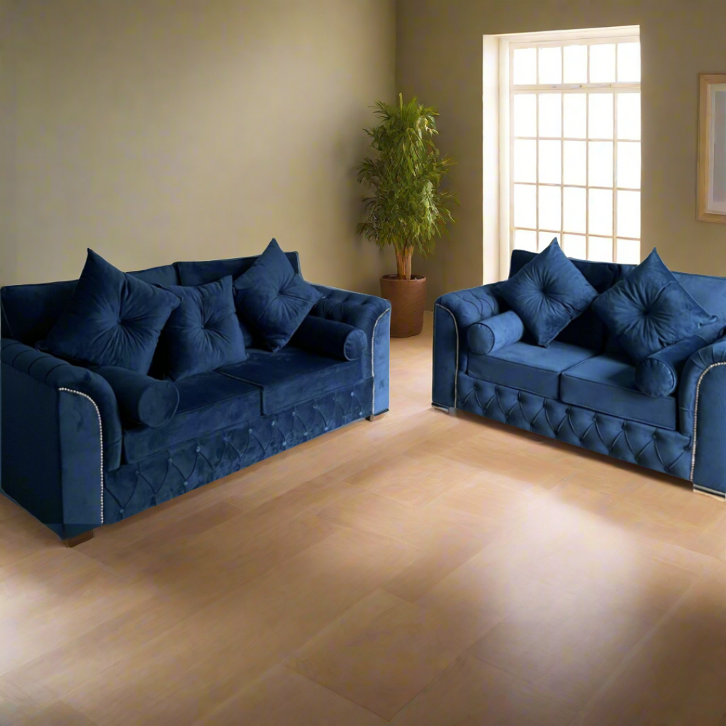 Expertly crafted with a beautiful navy blue finish, the Balfour 3 + 2 sofa set offers both comfort and style. With a spacious 3 seater measuring 193cm and a cozy 2 seater at 165cm, this set is perfect for any living space. Elevate your home décor with this sophisticated yet inviting sofa set.