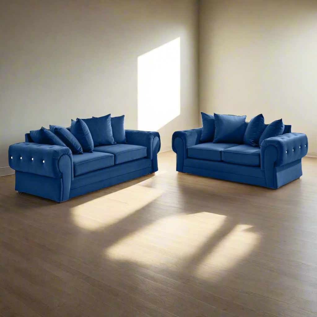 Introducing the Verona 3 + 2 Sofa Set with diamond in a beautiful Blue colour and Scatter back design. This affordable set is not only value for money, but also quality made for long-lasting comfort. Elevate your living space with this comfy and cosy addition.