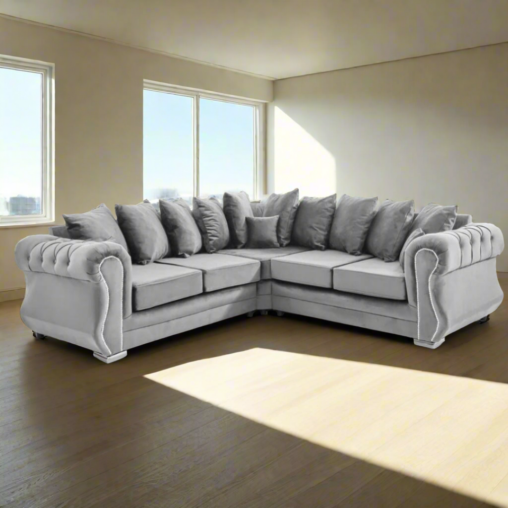Upgrade your living room with the Falcon Corner Scatterback Sofa in Plush Silver. This modern yet affordable piece offers great value for money, making it a must-have for any stylish home. With its sleek design and comfortable seating, it's the perfect addition to any space.