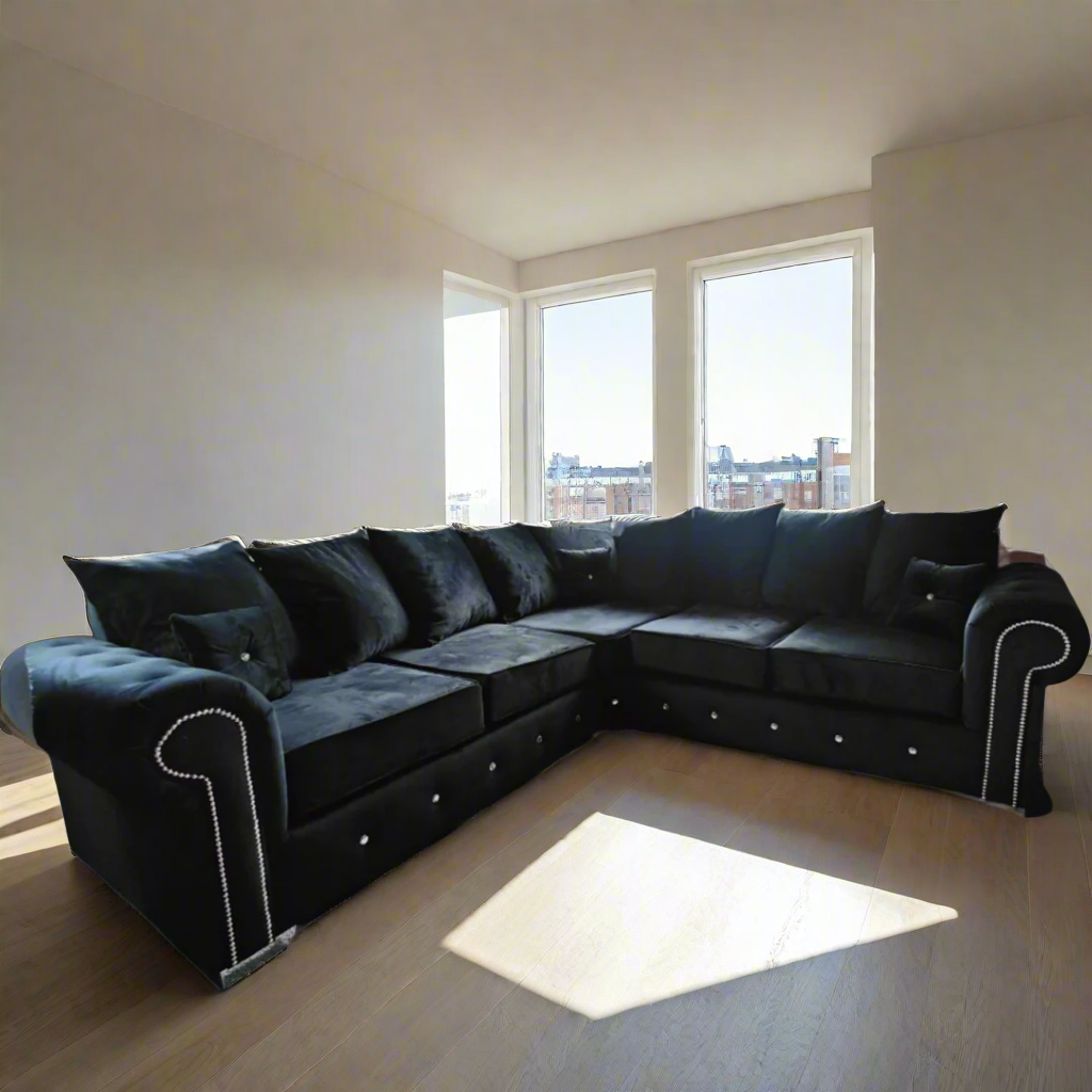 Upgrade your living room with the Olympia Corner Sofa in black with diamond pieces. This lovely and stylish piece is sure to elevate your space with its sleek design. Enjoy the benefits of comfort and sophistication with this elegant addition to your home.